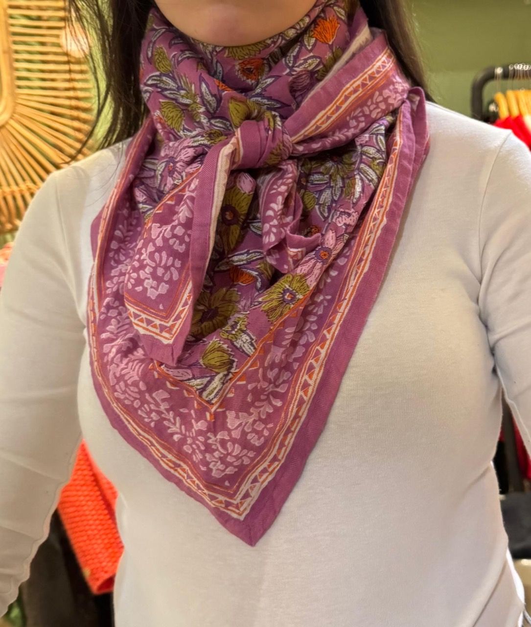 Petit foulard 100% coton, un carré coloré et imprimé à la main sur un tissu très doux au toucher peau de pêche, qui enveloppera votre cou pour un petit look boho-chic !