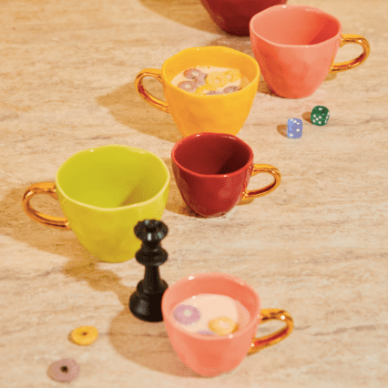 Tasse en porcelaine faite à la main avec anse dorée. Ce format est idéal pour savourer votre café espresso.